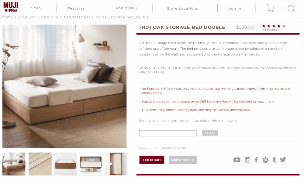 Within the 1st page, information regarding product description, price, dimensions, and shipping cost/information can all be viewed without scrolling. This allows the users to be aware of the availability of the product instead of out during the checkout process